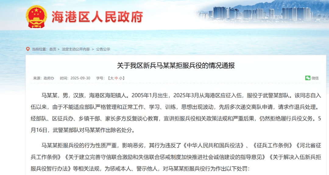 近日,河北省秦皇岛市海港区人民政府征兵办公室发布《关于我区新兵马某某拒服兵役的情况通报》: