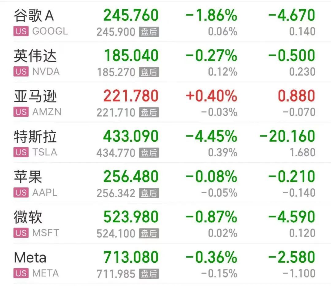 大型科技股多数下跌,特斯拉下跌4.46%,市值蒸发650亿美元(约合人民币4630亿元),谷歌下跌1.86%,英伟达、苹果、微软、Meta微跌,亚马逊上涨。