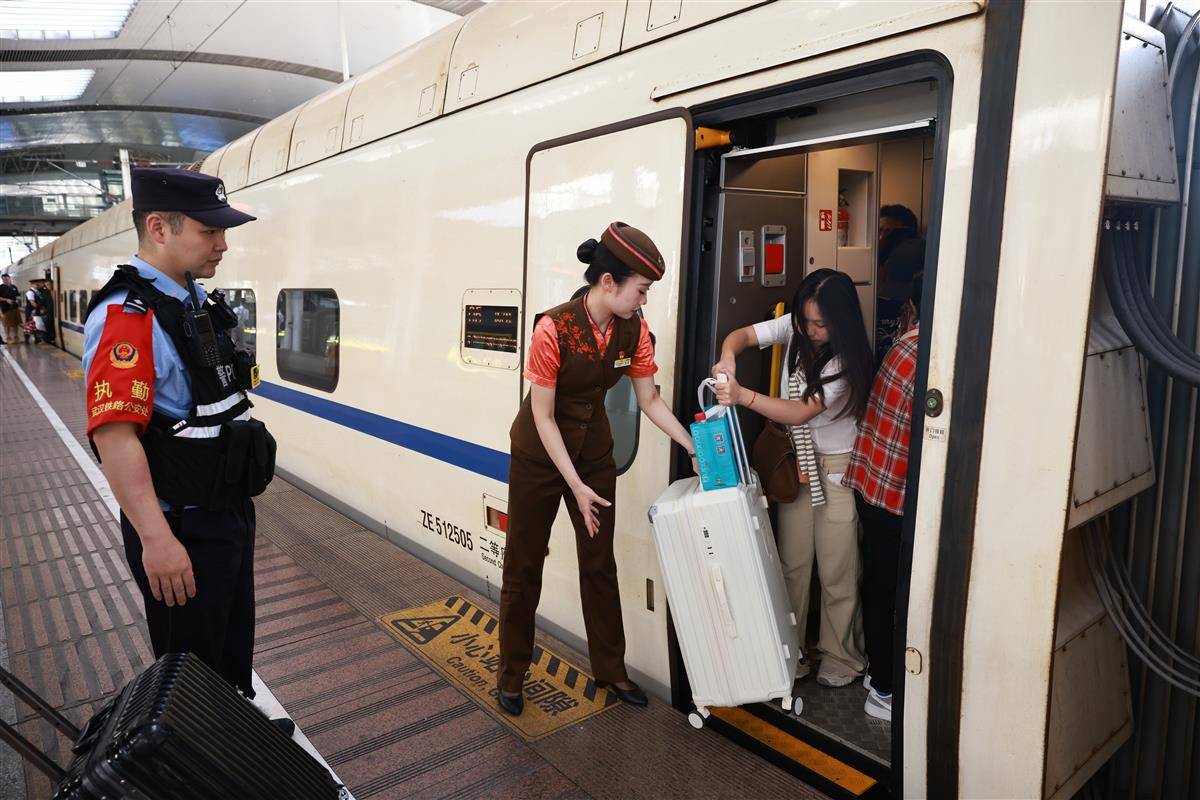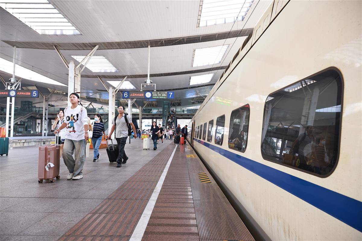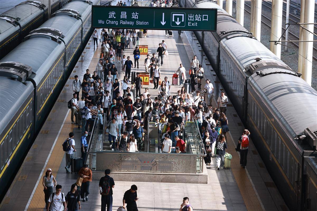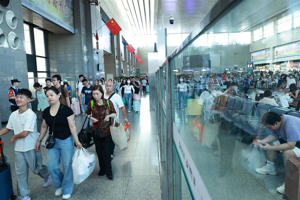 10月7日,武昌火车站内旅客有序乘车、抵达。当日,武汉铁路各大车站迎来返程高峰,仅武昌站就发送旅客6.4万人次、到达旅客10.8万人次。为保障旅客平安返程,武汉铁路公安以“主动警务、预防警务”理念为指引,通过“一站一方案”精准举措坚守岗位;武汉客运段则聚焦旅客出行需求,将精细化服务与动态运力调配相结合,共同为国庆假期运输安全顺畅保驾护航。(湖北日报全媒记者 魏铼 通讯员 陈诚 周赟玥 摄)