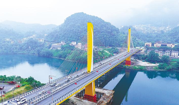 10月6日,鸟瞰已通车的清江市政特大桥,只见桥上车流不息,行车井然有序。据了解,该桥自今年7月1日通车以来,极大地缓解了长阳县城内的交通压力。双节期间,尽管车流增长,但长阳县城及周边没有出现严重堵车现象。 (湖北日报全媒记者 朱熙勇 摄)
