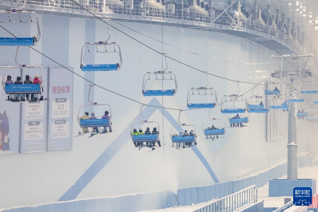 10月7日,滑雪爱好者在深圳·前海冰雪世界乘坐缆车。