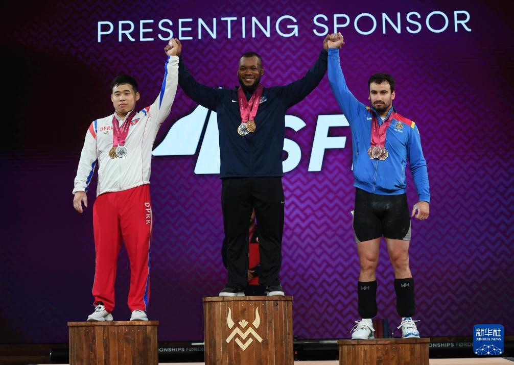 10月7日,总成绩冠军哥伦比亚选手洛佩兹(中)、亚军朝鲜选手罗光列(左)和季军摩尔多瓦选手罗布在颁奖仪式上合影。