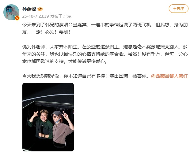 10月7日,歌手韩红在北京演唱会透露好友孙燕姿多年来通过韩红爱心慈善基金会匿名捐款超过千万元,并一直以“孙女士”署名,叮嘱不要公开其姓名。韩红觉得需要宣传好人好事,时代也需要正能量,引现场观众共鸣。