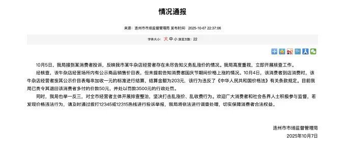 10月7日,广东连州市市场监督管理局发布情况通报:10月5日,我局接到某消费者投诉,反映我市某牛杂店经营者存在未尽告知义务乱涨价的情况。我局高度重视,立即开展核查工作。
