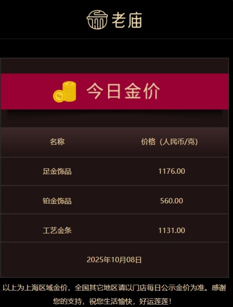 10月8日,国内金饰价格跟涨,老庙黄金足金饰品标价1176元/克,周生生足金饰品标价1165元/克。