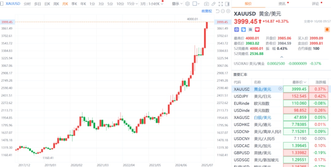 财联社10月8日电,现货黄金突破4000美元/盎司大关,续创新高,年内涨幅超52%。