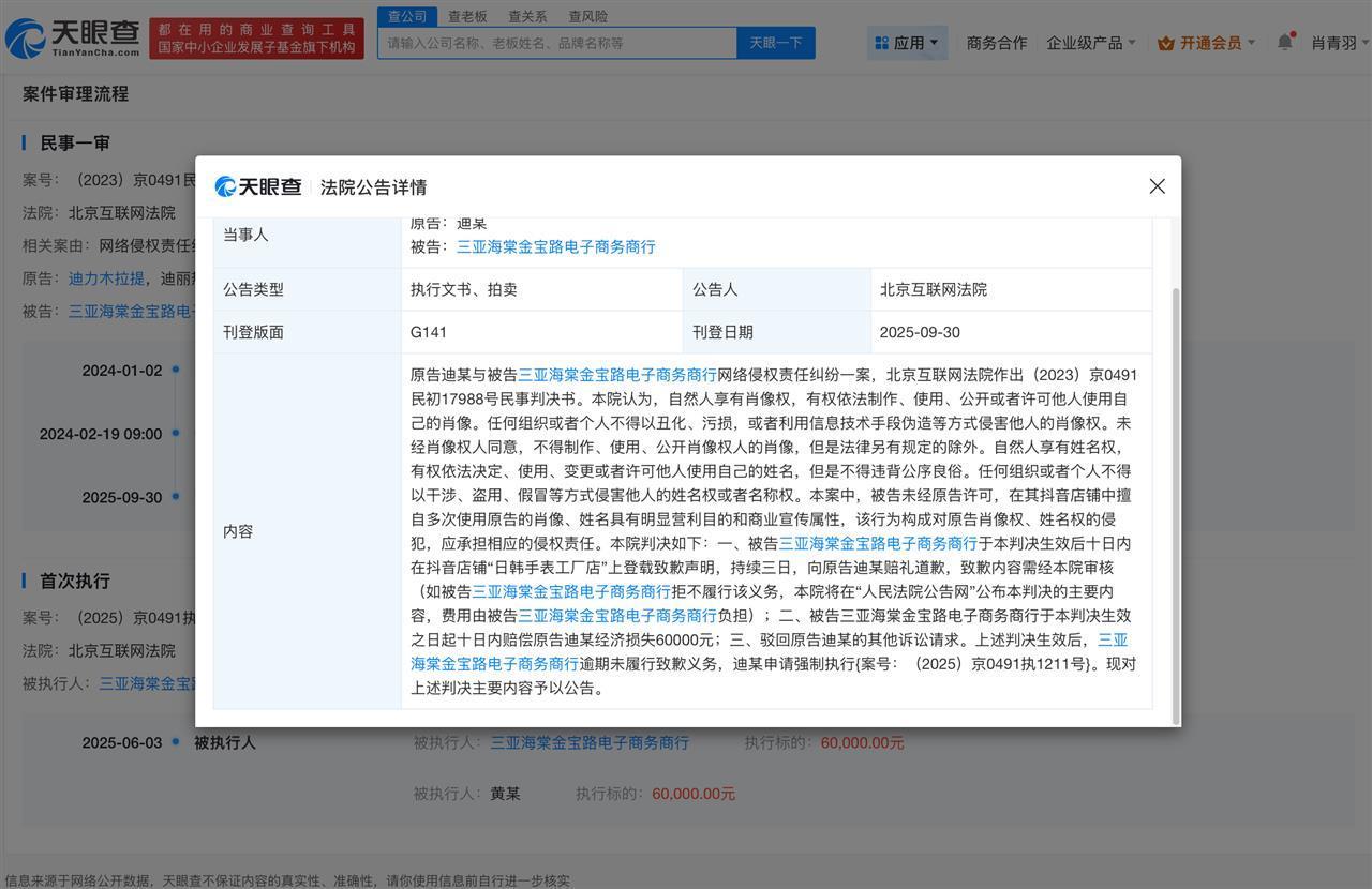 此外,同日,三亚海棠金宝路电子商务商行因构成对迪丽热巴肖像权、姓名权的侵犯,被判决向原告迪丽热巴公开赔礼道歉,赔偿经济损失6万元。三亚海棠金宝路电子商务商行未履行生效判决确定的致歉义务,迪丽热巴申请强制执行。