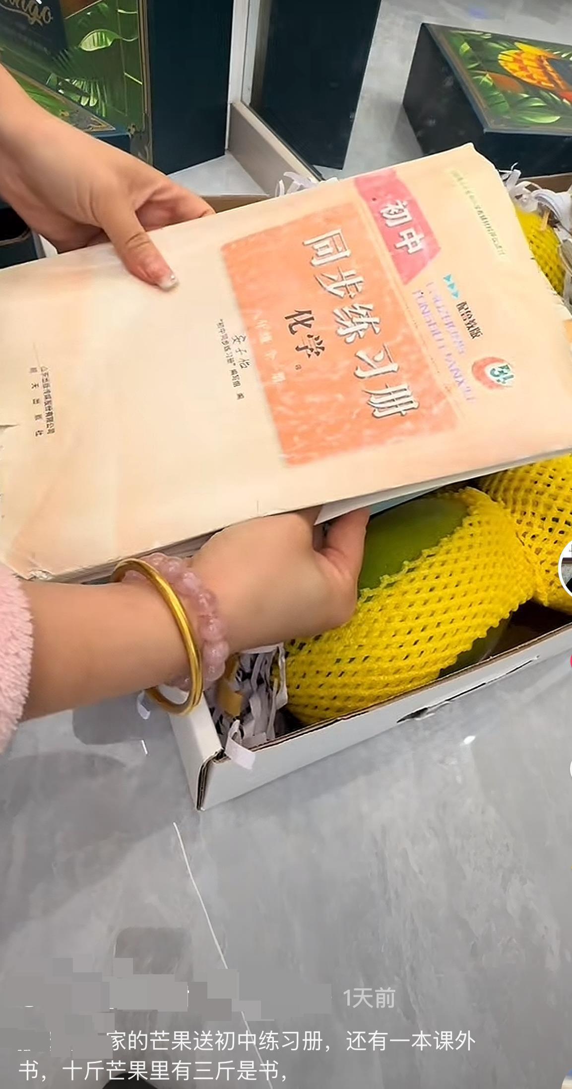 多名网友发布的视频显示,打开礼盒外包装后,里面放着数个芒果,下方垫着纸丝和一些吸水纸,在吸水纸下方,则叠放着来历不明的书本和纸张,有批改后的散装学生作业、试卷,也有使用过的《5年中考3年模拟》成册试卷,还有《语文》和六年级《道德与法治》教科书等。一名网友配文称,刷抖音看到芒果礼盒里有书本的视频后,打电话让家人看看自己买的礼盒,发现也有小学练习册。另有网友通过社媒称,买芒果送初中练习册,十斤芒果里有三斤是书。因所购买的芒果礼盒,不少为国庆中秋假期走亲戚之用,有网友将其称为“断亲礼盒”。
