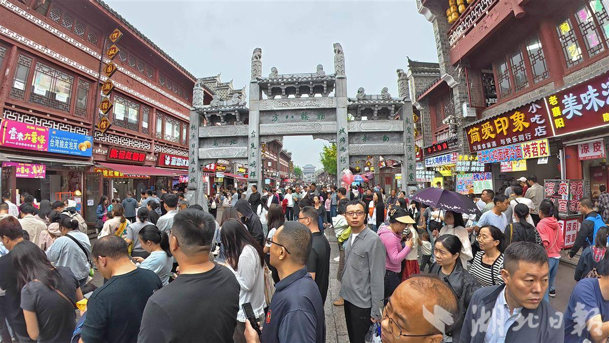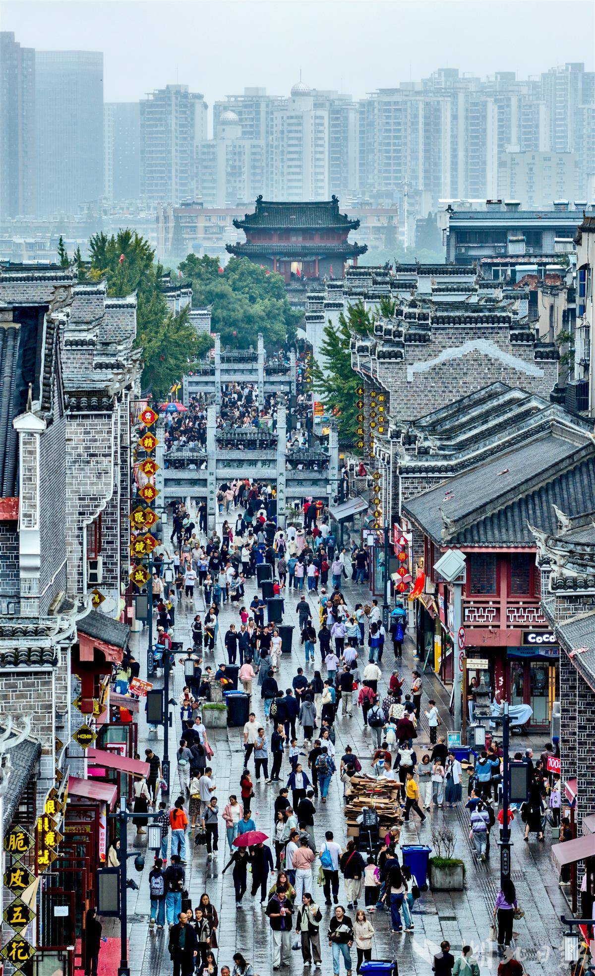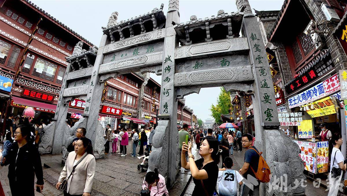 10月6日,国庆黄金周进入尾声,襄阳北街青石板路上依旧人潮涌动,16 时至 20 时返程高峰时段,民主街、荆州街等周边路段摩肩接踵,撑伞漫步的游客与沿街吆喝的商贩交织成热闹图景,成为襄阳黄金周文旅火爆的生动缩影。今年黄金周,襄阳文旅以 “新地标 + 强 IP” 实现全域升温。从古城街巷到滨水新区,襄阳以 “文化 + 交通 + 科技” 融合之力,再度成为华中地区旅游热门之选。(湖北日报全媒记者 刘曙松 通讯员 王虎 摄)