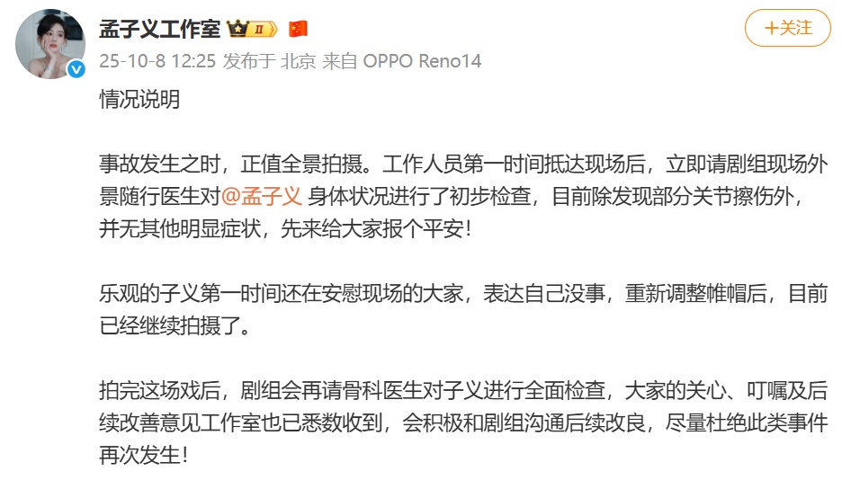 事故发生之时,正值全景拍摄。工作人员第一时间抵达现场后,立即请剧组现场外景随行医生对孟子义身体状况进行了初步检查,目前除发现部分关节擦伤外,并无其他明显症状,先来给大家报个平安!