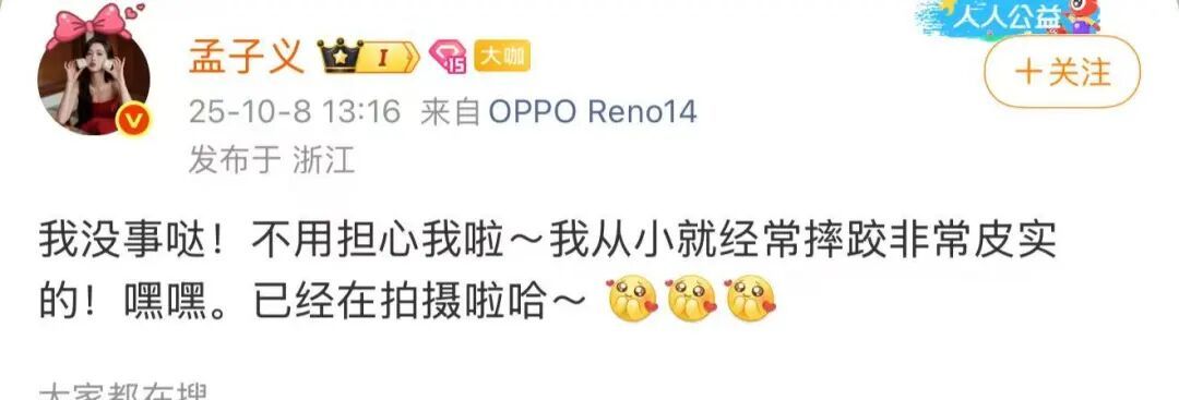10月8日,#孟子义拍戏摔了# 登上热搜,引发关注。随后,@孟子义 发文报平安:“我没事哒!不用担心我啦,我从小就经常摔跤非常皮实的!嘿嘿。已经在拍摄啦哈。”