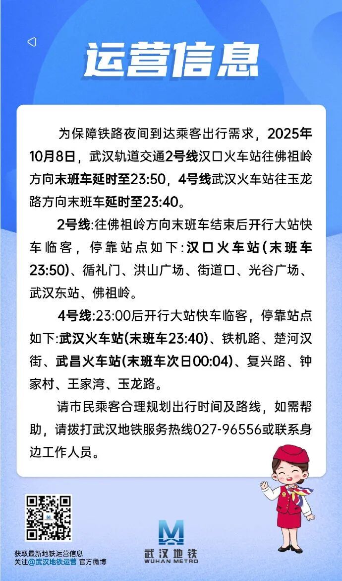 据@武汉地铁运营 10月8日消息,为保障铁路夜间到达乘客出行需求,2025年10月8日,武汉轨道交通2号线汉口火车站往佛祖岭方向末班车延时至23:50,4号线武汉火车站往玉龙路方向末班车延时至23:40。