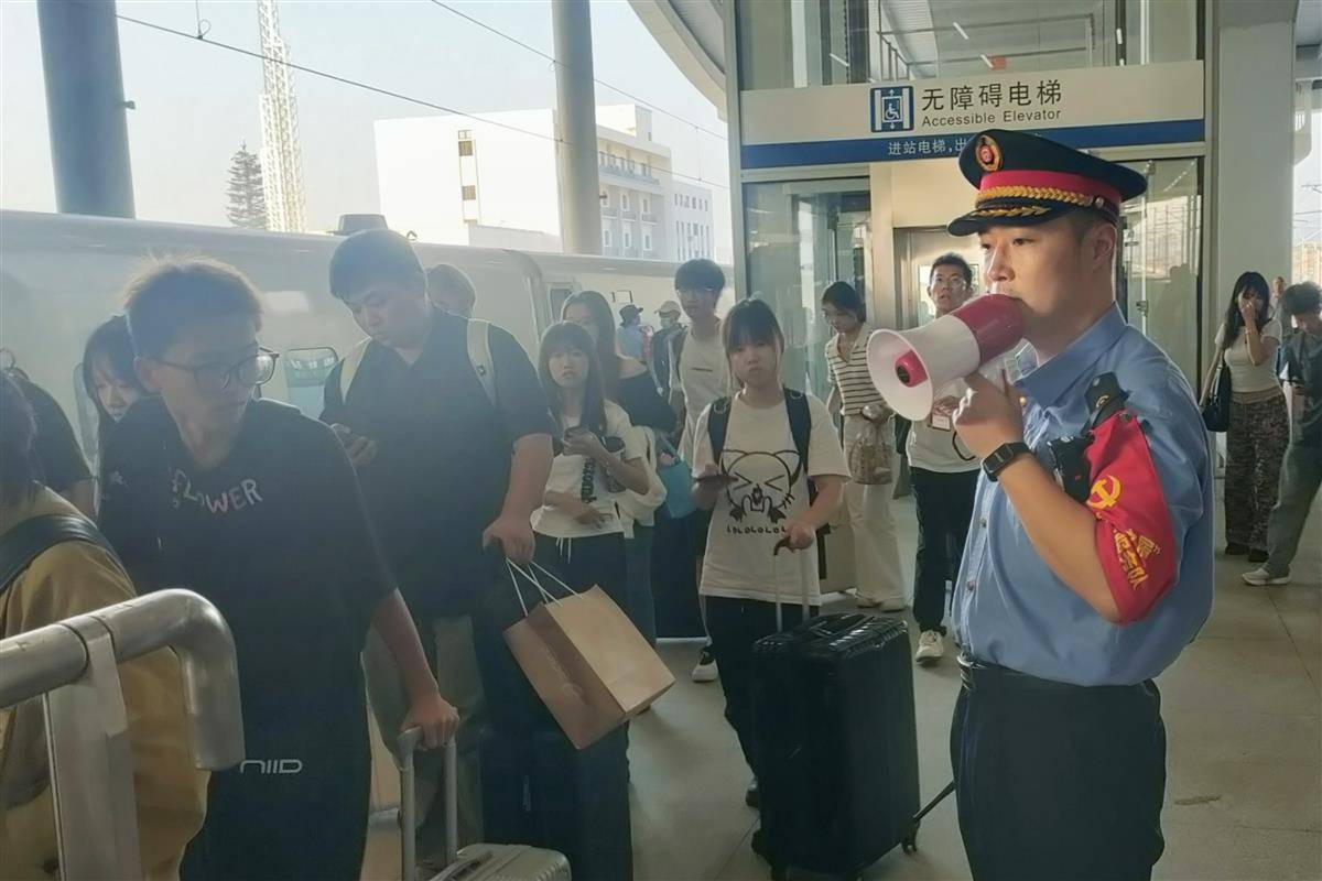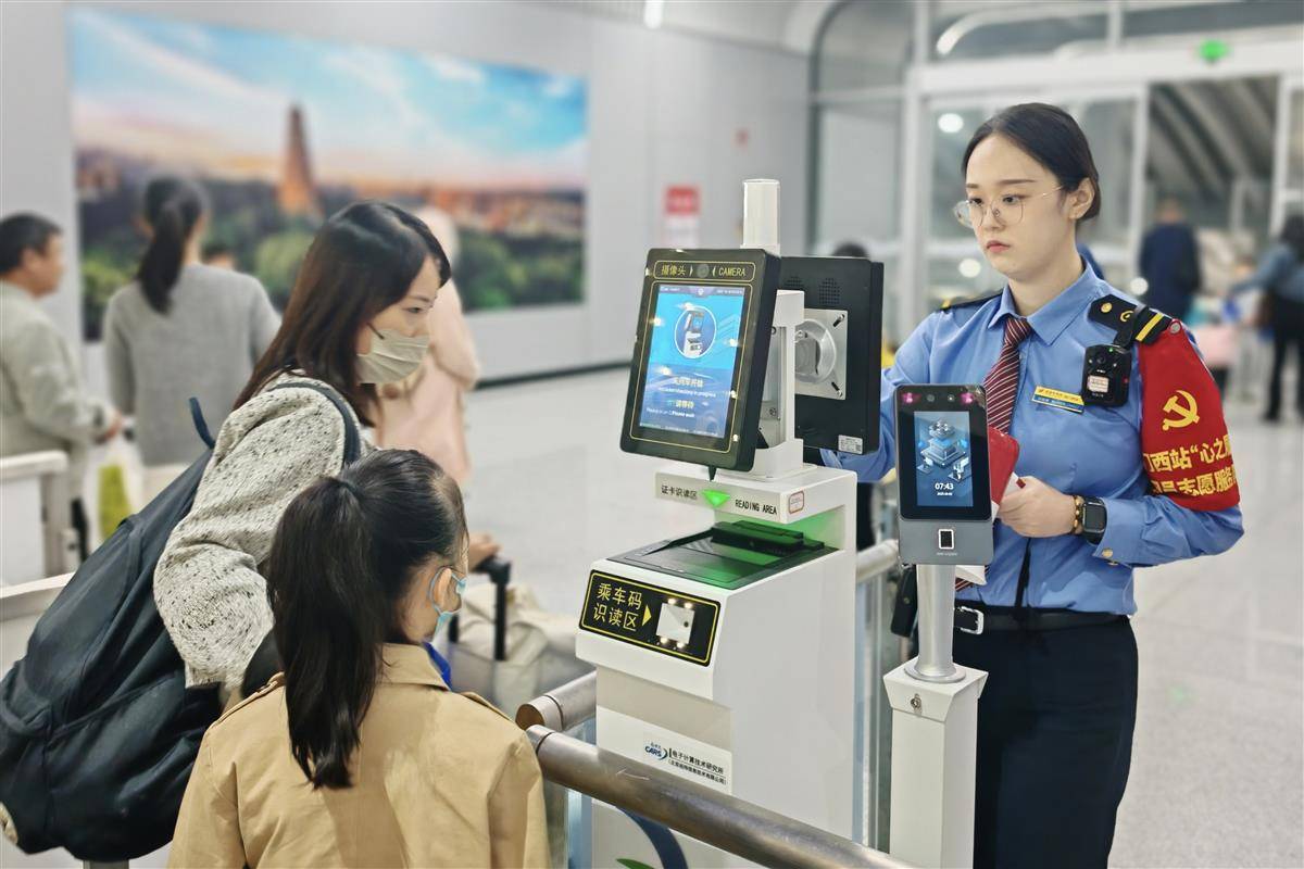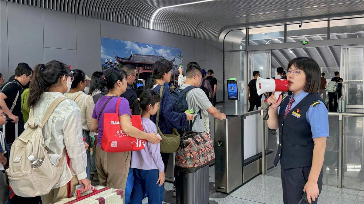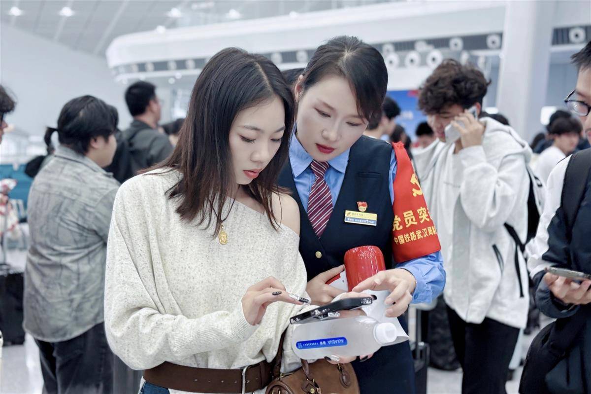 据了解,面对激增客流,荆门西站精准施策保障畅通:针对高峰车次提前20分钟开启双通道检票;因线路升级为途经站,站台实施分区排队引导,党团员突击队值守重点车厢,专人防护扶梯安全;动态优化国庆临客“一车一案”,高效匹配运能需求。安检环节全员上阵,20名安检人员高峰时段增开通道至四个,确保进站流速。(湖北日报全媒记者 陈少哲 通讯员 李丽 摄)
