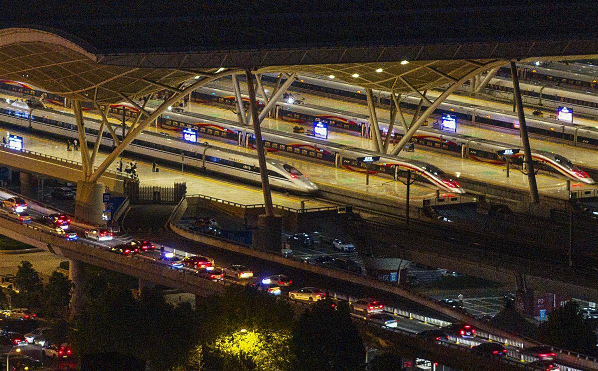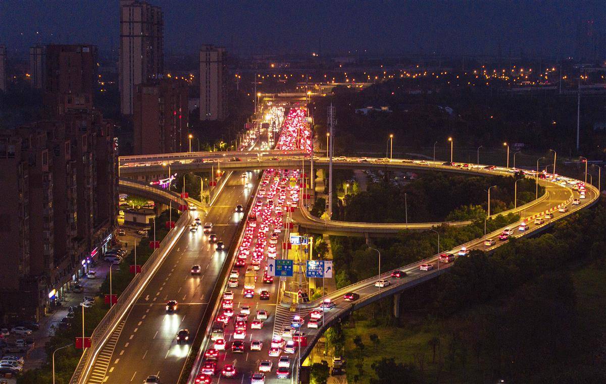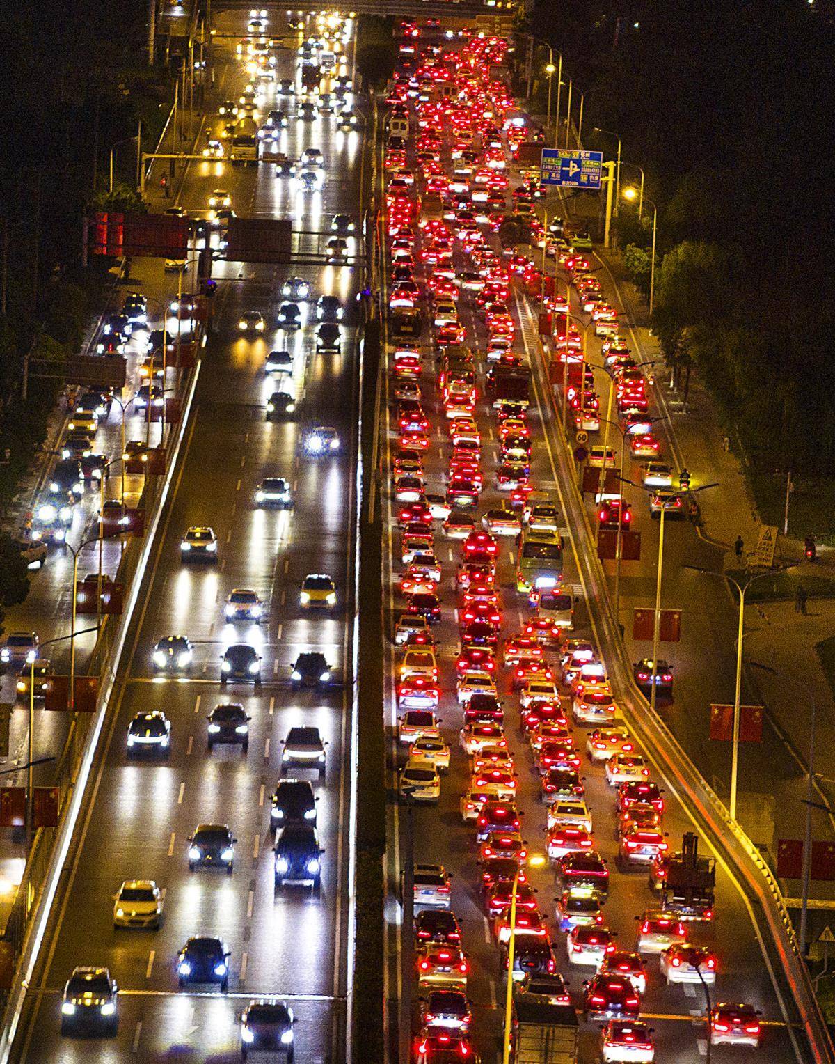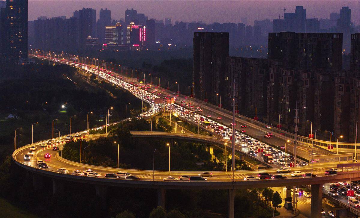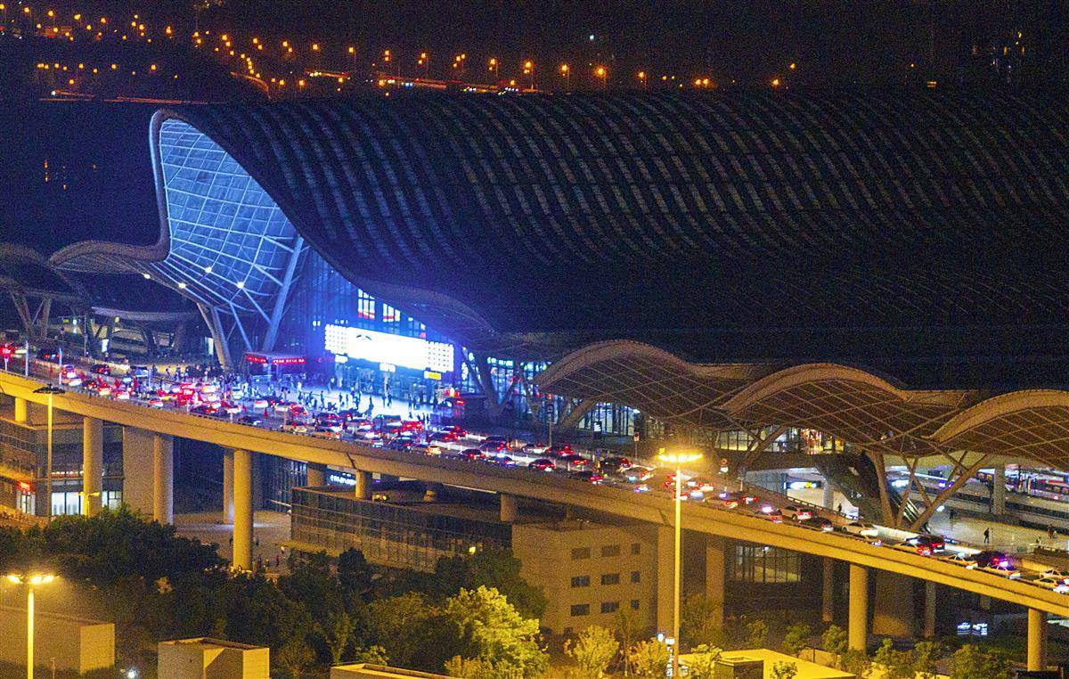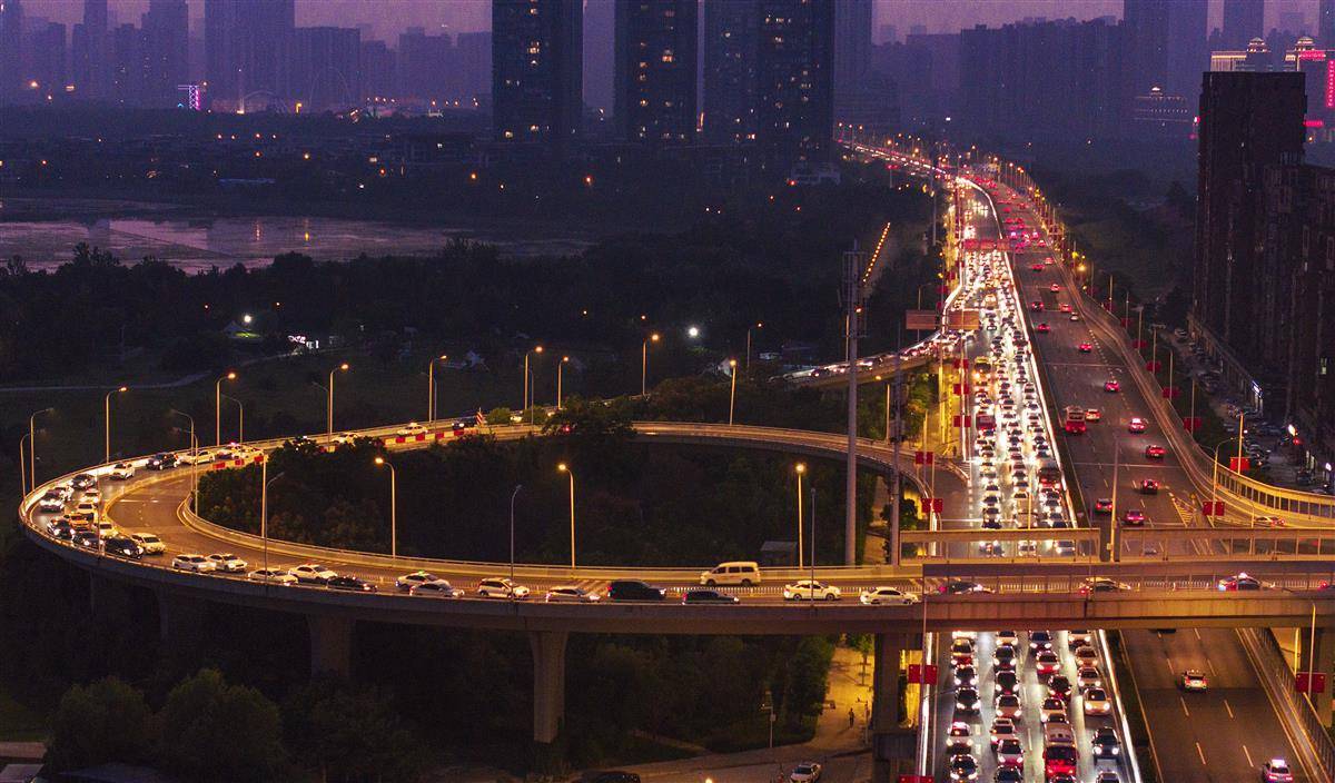 10月8日,是国庆中秋长假最后一天,来武汉探亲旅游的游客陆续返程。当日傍晚,从欢乐大道高架桥出城和到武汉站接送旅客的车辆出现缓行的状态。(湖北日报全媒记者 朱熙勇 摄)