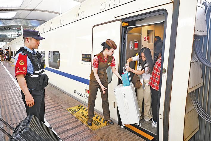 10月7日,武昌站内列车乘务员贴心服务旅客。 (湖北日报全媒记者 魏铼 摄)