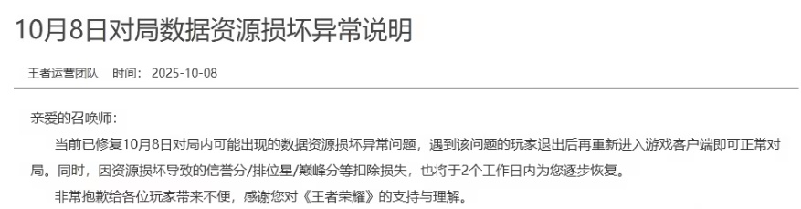 10月8日,《王者荣耀》官方运营团队发布公告,确认已修复异常问题并承诺恢复积分:“当前已修复10月8日,对局内可能出现的数据资源损坏异常问题,遇到该问题的玩家退出后再重新进入游戏客户端即可正常对局。