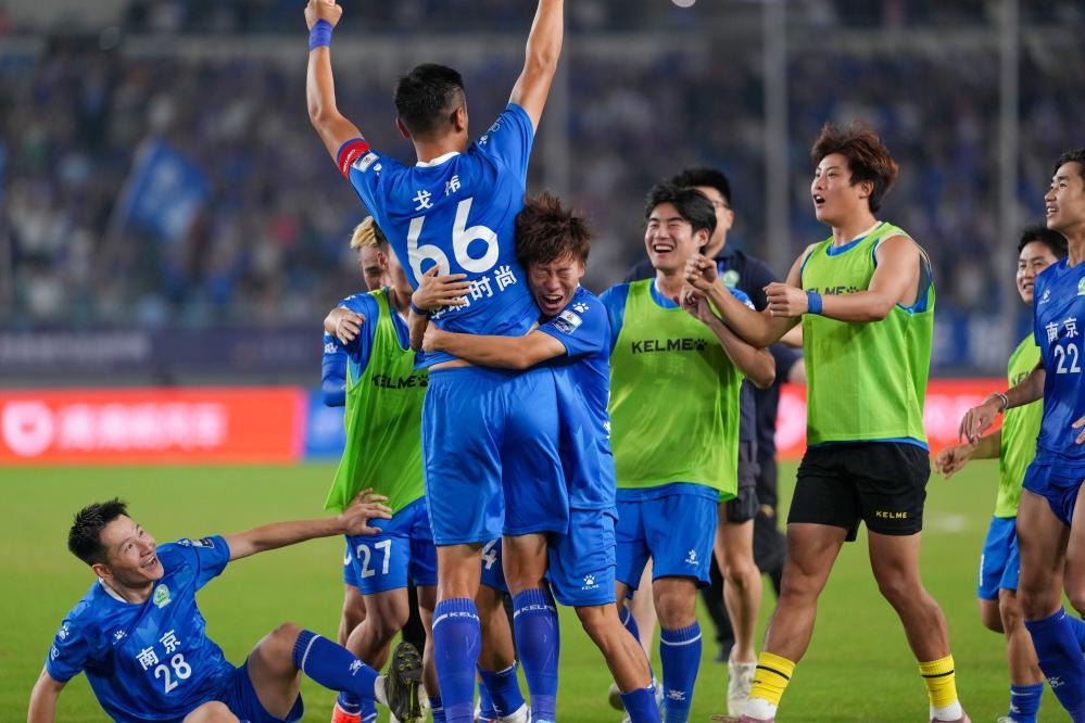 10月4日,南京队球员赛后拥抱庆祝胜利。当日,在江苏南京举行的2025江苏省城市足球联赛(“苏超”)四分之一决赛中,南京队主场与连云港队在常规时间1:1战平,通过点球大战,南京队以5:3的总比分战胜连云港队,晋级半决赛。新华社记者 李博 摄