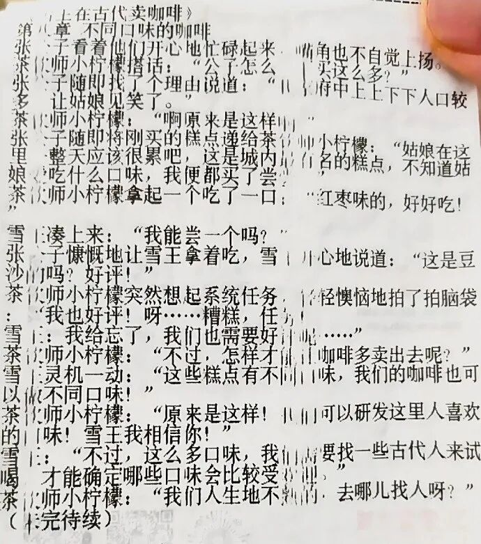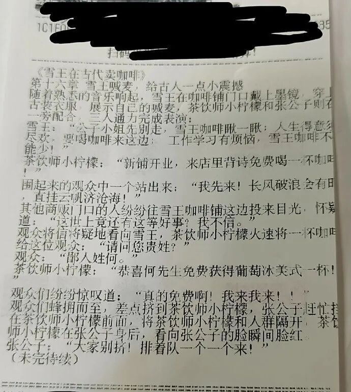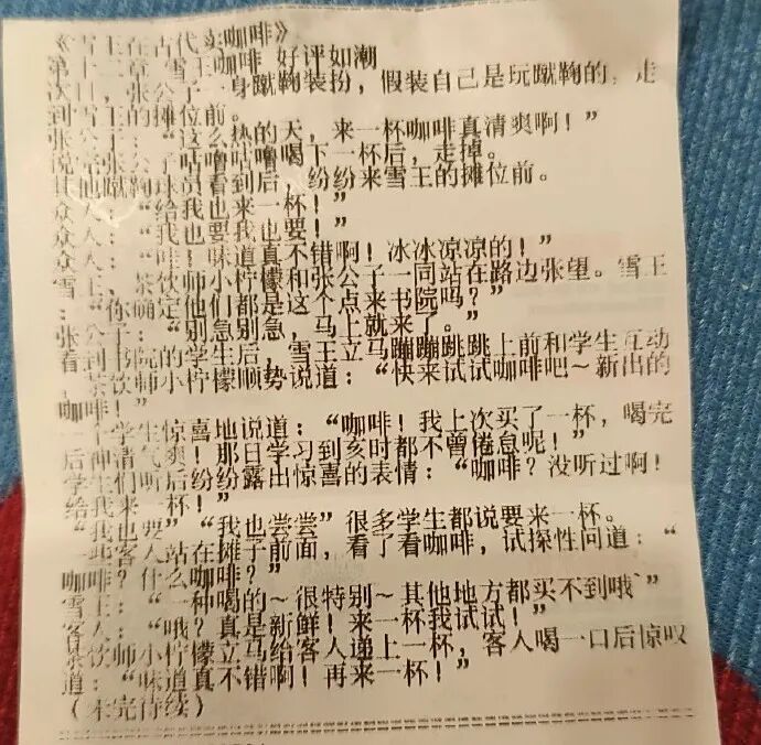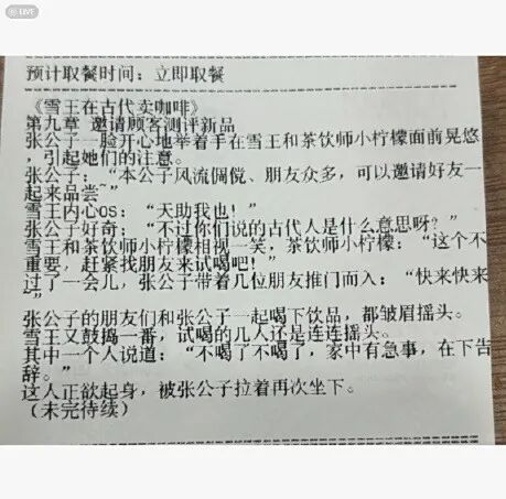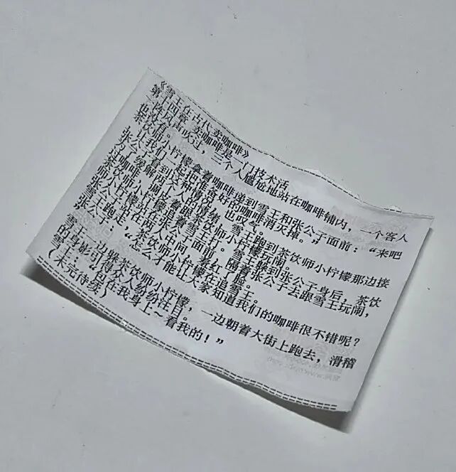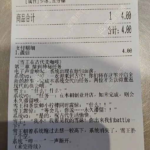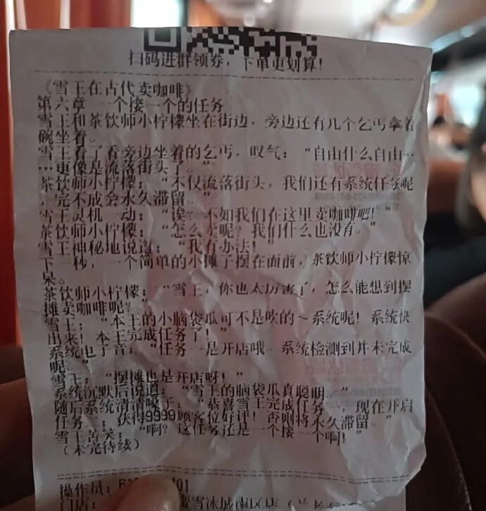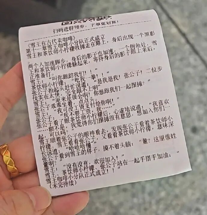 近日,有网友在社交平台发帖求助,称购买蜜雪冰城奶茶时发现小票上印有连载小说,急切询问“谁有之前的章节”。