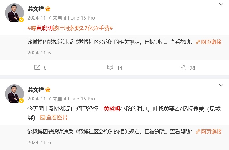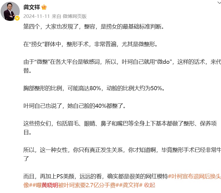 记者搜索发现,这名被告的自媒体博主龚文祥微博粉丝超300万,曾在黄晓明叶珂陷入恋情风波时多次发文,提到“分手”“捞女”“生理性厌恶”等词汇。