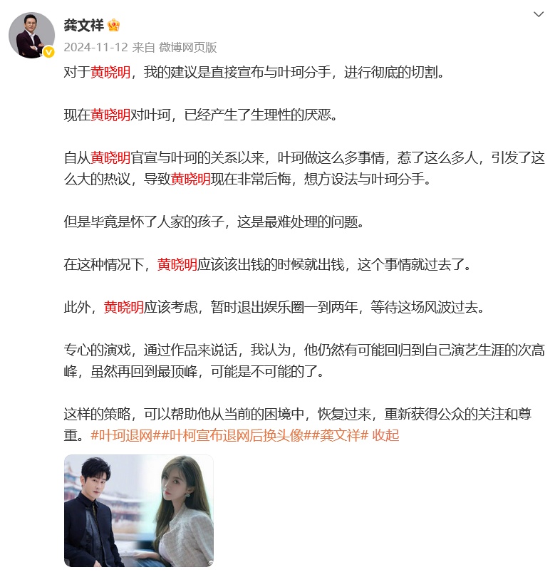 2024年12月2日,有媒体发现黄晓明百科人物关系已显示叶珂为“前女友”。