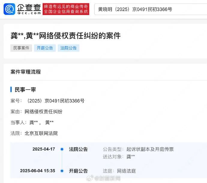 而这也并非黄晓明首次起诉自媒体博主龚文祥。据封面新闻4月17日报道,企查查APP显示,法院送达黄晓明与自媒体博主龚文祥网络侵权责任纠纷起诉状副本及开庭传票,案件定于6月4日开庭审理。
