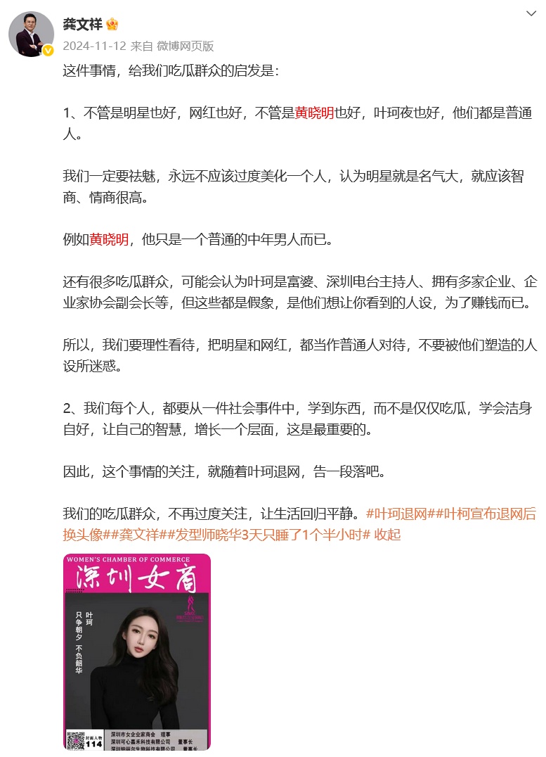 2024年11月28日,黄晓明的个人账号中,此前官宣和叶珂在一起的那条微博已经搜不到。从官宣到不可见,这条微博存在才刚满2个月。