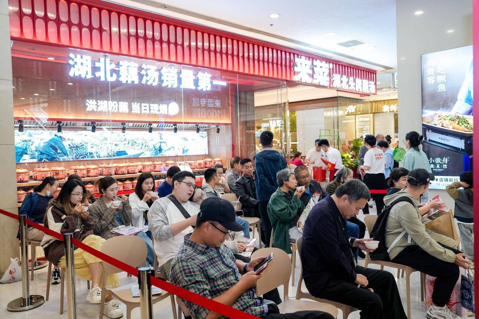 一桌楚菜引爆味蕾体验。肥肥虾庄黄鹤楼联名店假期客流环比增长超4成,高峰期等位一度达3500桌;湖锦、三五醇、小蓝鲸、肖记公安牛肉鱼杂等餐厅平均上座率达135%;来菜省外门店凭一罐浓郁鲜香的藕汤征服消费者味蕾,高峰期等位超千桌,带动楚菜飘香全国。