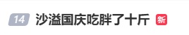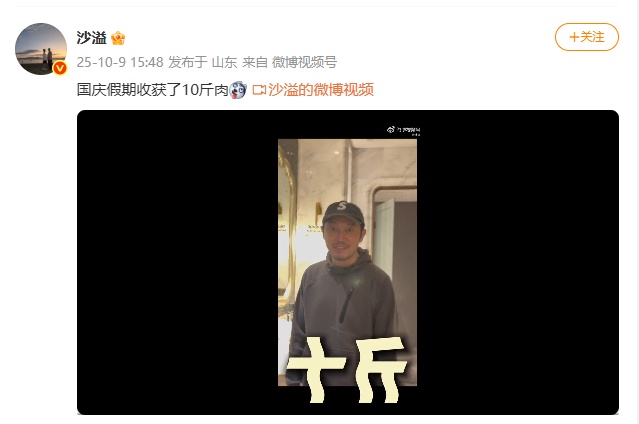 10月9日,@沙溢 发文表示:国庆假期收获了10斤肉”。此外,沙溢还做了个视频合集,视频中沙哥不是在吃就是在睡,最后称体重发现胖了10斤后被重磅一击。