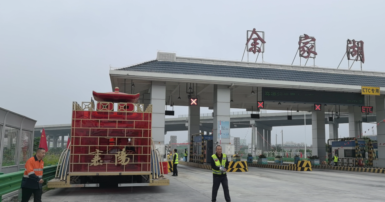 当日8 时10分,正值国庆高速免费通行的车流高峰,“侠义襄阳”花车在护卫车与拖车的牵引下,缓缓驶入余家湖收费站。然而,因花车车身超宽超长,到达车道口时无法正常通过,后方等待车辆逐渐积压,现场通行压力骤增。面对突发情况,余家湖收费站当班班长迅速反应,一边开启专用通道疏导后方车辆,避免拥堵加剧;一边第一时间向值班领导汇报情况,并通知机动人员赶赴现场支援。值班领导与机动人员抵达现场,组成临时应急小组。小组成员与花车运送人员充分沟通,快速制定出通行方案 —— 先将拖车与花车分体,为花车安装临时电机实现自主行驶,同时将原本的超宽自助通道切换为人工操作模式,确保花车通行过程安全可控。