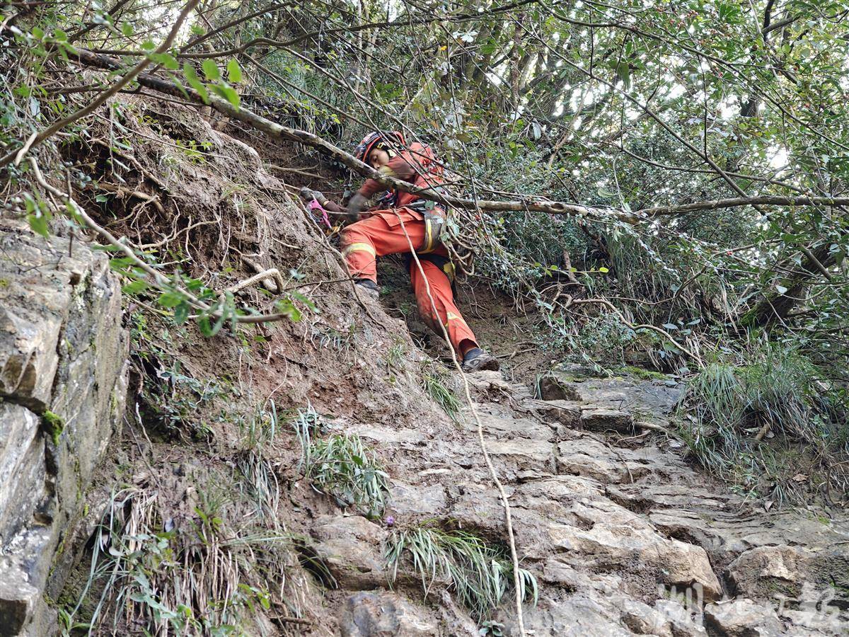 途中,其中一名男子因虚脱陷入昏迷无法行走,由于男子体重较重,山路崎岖,脚下是300多米的悬崖,再加上由于山中持续降雨,山路湿滑,转移难度较大。大队随即派出4人前往增援。次日凌晨4时增援人员到达现场,经过简单处理后,利用多功能担架将昏迷人员固定后,运用山岳绳索救援装备搭建倍力救援系统,利用扁担缠绕多个粗壮树木,制作两个自然锚点,采取向上提拉的方式,将被困人员转移至安全区域。