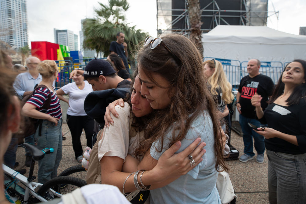 10月9日,在以色列特拉维夫,人们获悉加沙停火协议的消息后相互庆祝,期待被扣押的人员早日获释。新华社记者陈君清摄