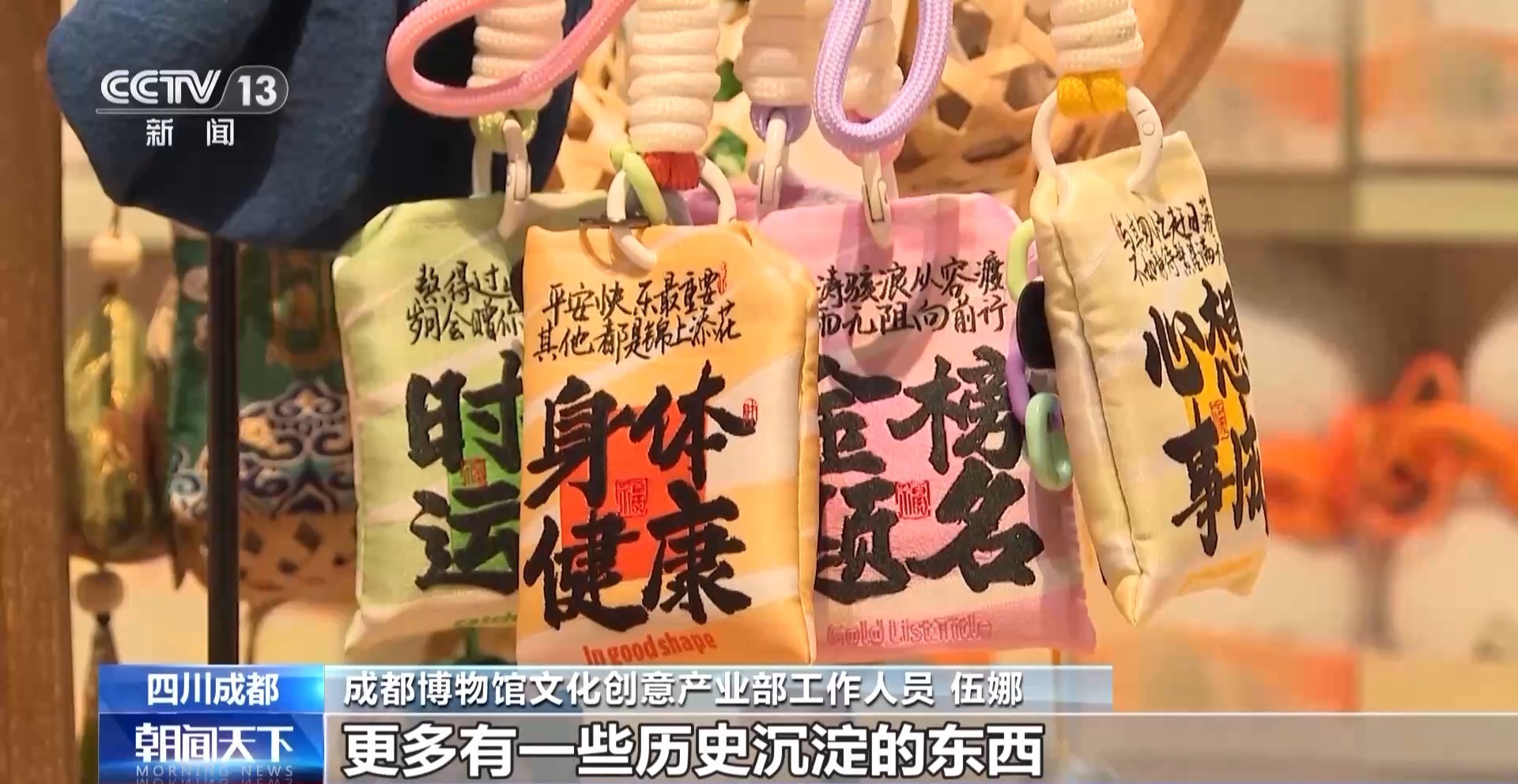 成都博物馆文化创意产业部工作人员 伍娜:我们会做适合不同的年龄段的不同的品类,比如说适合小朋友的,有文具类、贴纸类。年轻人大家就喜欢潮玩手办类,然后服饰类。可能中青年就喜欢更多有一些历史沉淀的东西,类似于丝巾、茶具。