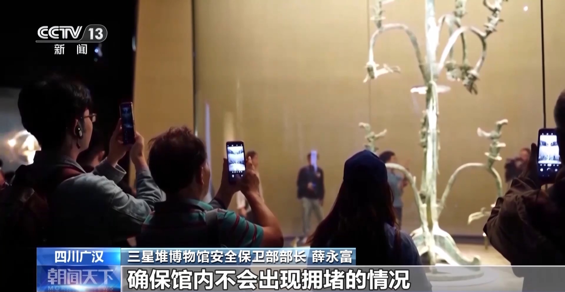 三星堆博物馆安全保卫部部长 薛永富:一楼展厅现在为红色,提示客流较为密集,这个时候我们会用对讲机,通知现场的工作人员,将游客引导到其他绿色区域进行参观。这套系统让我们从被动应对变为主动预警,确保馆内不会出现拥挤的情况。