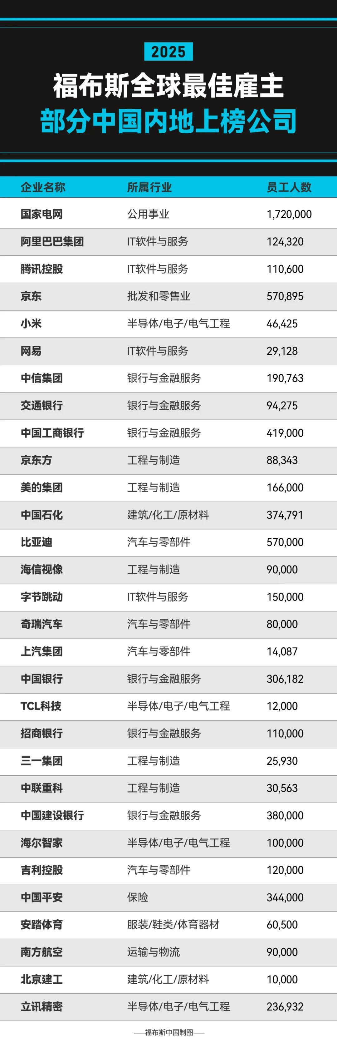 以下为2025年福布斯全球最佳雇主榜单中的部分中国内地公司: