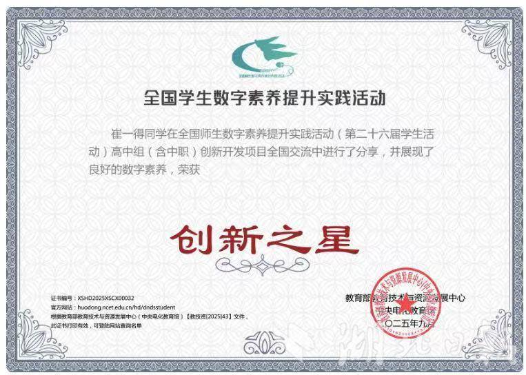 据了解,此次全国师生数字素养提升实践活动覆盖数字艺术、计算思维、科创实践等多个领域。计算思维类别竞赛,现场任务挑战性极高,要求选手在7小时内,运用至少一种AI或AR等新技术,完成一项与校园生活相关的创新开发。经过激烈角逐,崔一得从全国141支参赛队伍中脱颖而出,跻身仅30个席位的“创新之星”行列。