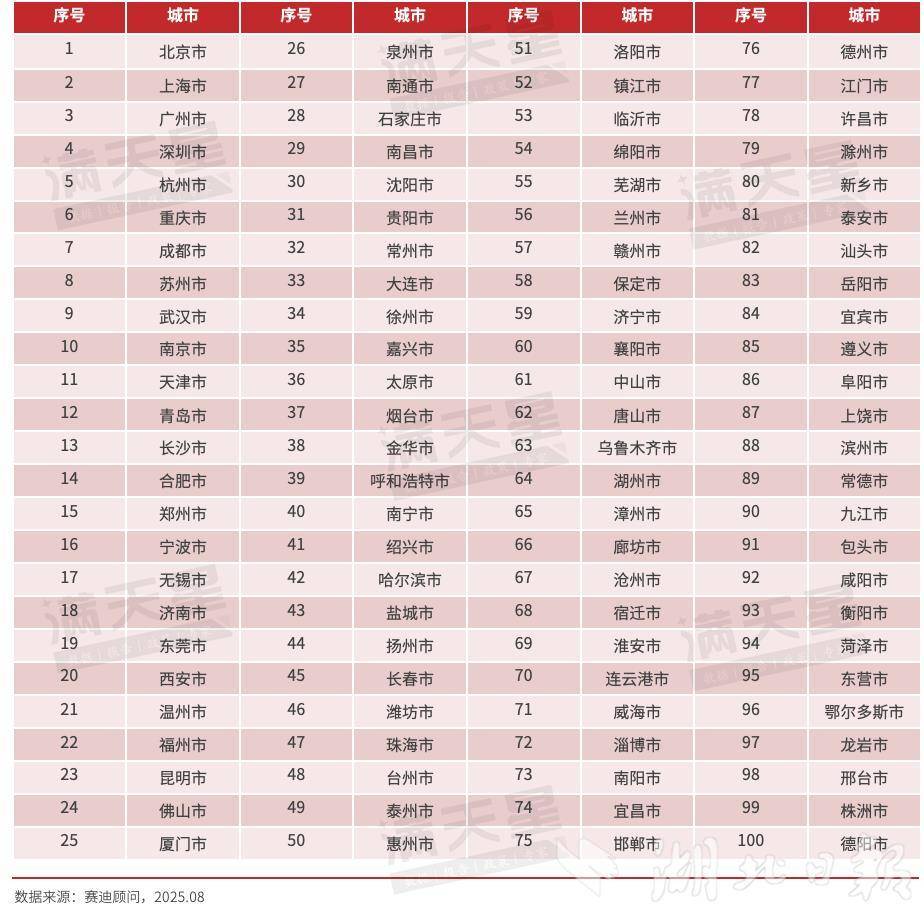 湖北日报讯(记者张倩倩、通讯员王华芬)近日发布的《2025年中国数字城市竞争力研究报告》显示,武汉在数字经济百强市榜单中位列全国第9,较上年再提升一个位次,实现连续两年稳步进位,展现出强劲的发展势头。