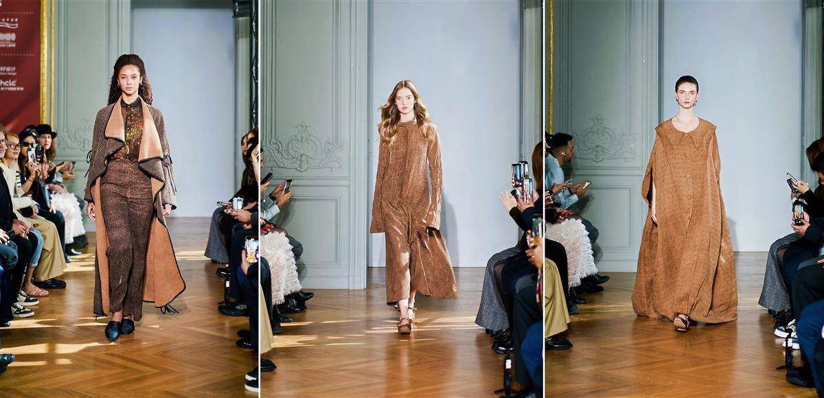 “时况|ERA KUANG”香云纱系列作品亮相中法时装周第三届“中国服装好设计”联合发布秀现场。武汉设计工程学院供图