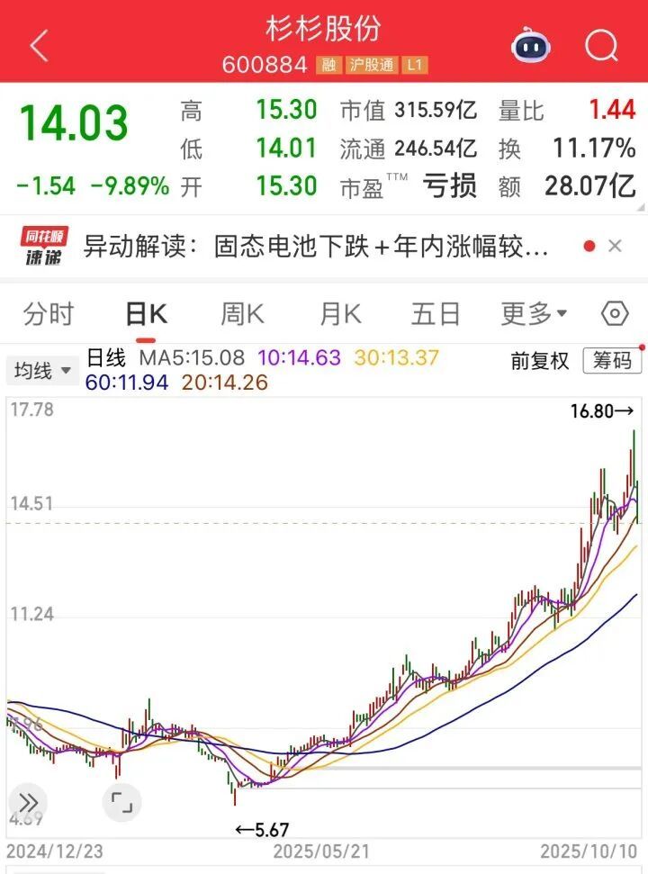 国庆长假后的首个交易日,杉杉股份跌2.08%。10月10日,受固态电池板块整体调整等因素的影响,股价大跌9.89%,收盘报价14.03元/股,当前市值316亿元。