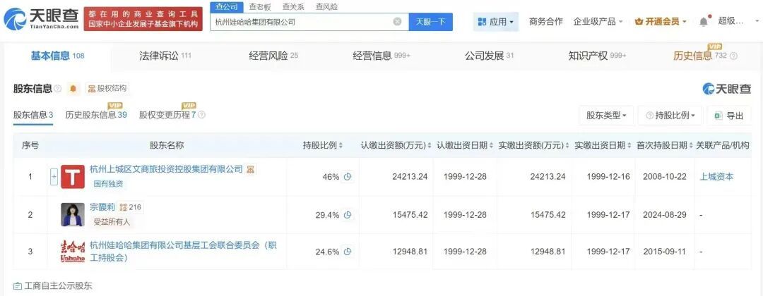 杭州娃哈哈集团有限公司成立于1993年2月,注册资本约5.26亿人民币,由杭州上城区文商旅投资控股集团有限公司、宗馥莉、杭州娃哈哈集团有限公司基层工会联合委员会(职工持股会)共同持股,其中宗馥莉持股29.4%。