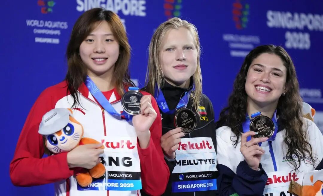 新加坡世锦赛女子50米蛙泳决赛,立陶宛世界纪录保持者梅卢蒂特(中)以29秒55实现四连冠,唐钱婷获得亚军,成绩为30秒03。意大利皮拉托(右)获得铜牌。图片来源:世界泳联