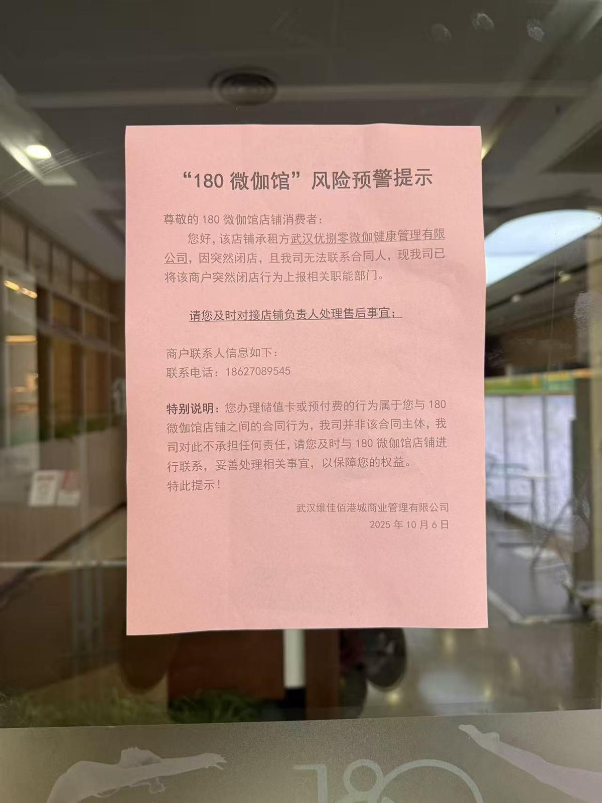 “刚看到群里的告别信,还没反应过来,群就没了。”10月7日,多位市民向极目新闻热线反映,2013年就在武汉开店的迈索尔优+瑜伽,于10月5日23点45分左右,在各店会员群突然发出一封“道歉与告别信”,宣布自10月6日起,该品牌在武汉的所有场馆全面停止运营。随后火速解散了所有会员群,这场毫无征兆的“告别”,让会员们面临充值卡余额无处可退的困境。