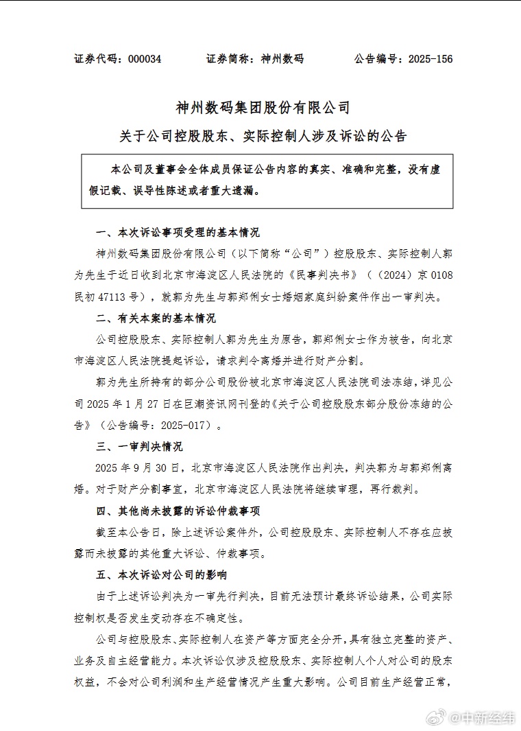 10月10日,神州数码公告,控股股东、实际控制人郭为涉及的婚姻家庭纠纷案件于2025年9月30日作出一审判决,判决其与郭郑俐离婚。而对于财产分割事宜,法院将继续审理,再行裁判。