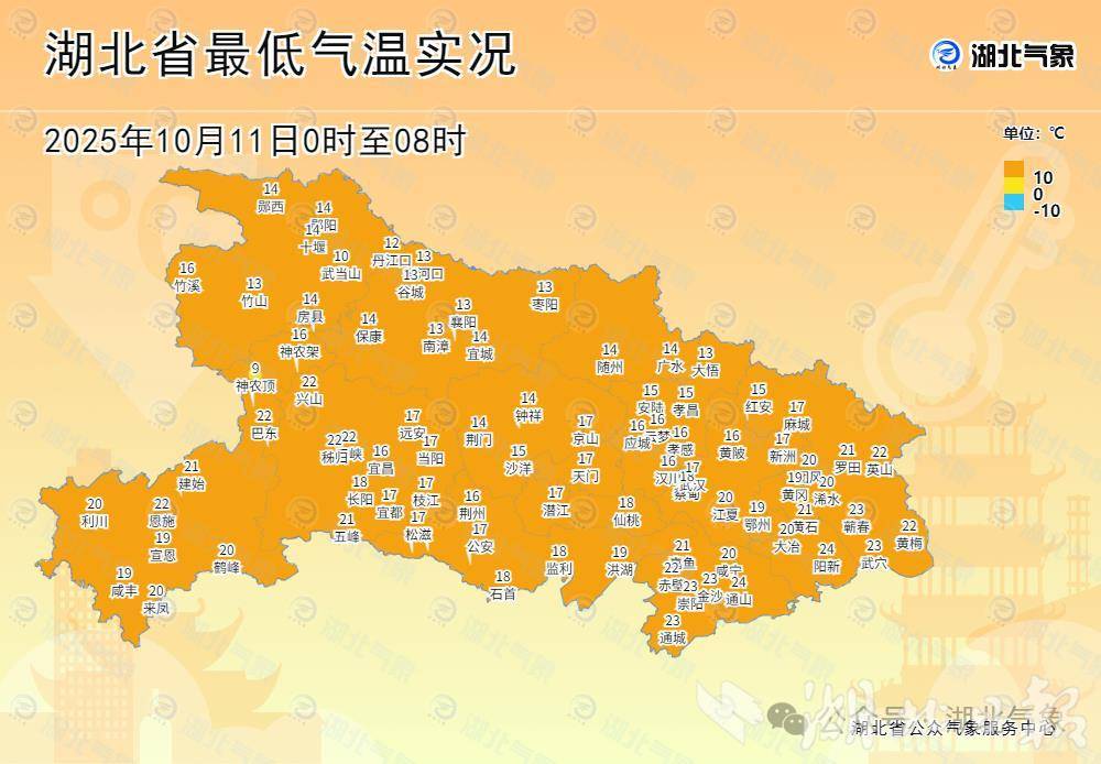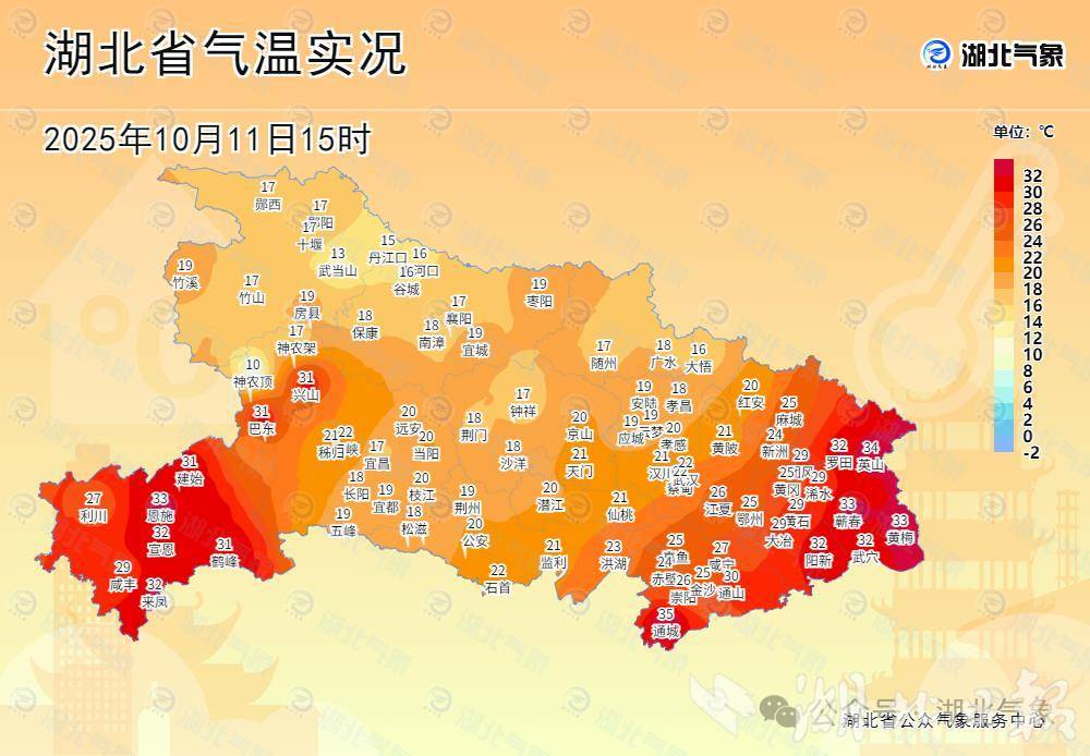 11日清晨,鄂西南及东部地区最低气温20至24℃,而武汉、荆门等多地最低气温跌破20℃,创下今年入秋以来的气温新低。午后阴云遮挡进一步抑制升温,15时十堰、襄阳、随州、荆门、孝感等地气温不足20℃,监利更是较10日同一时段骤降近14℃,仅21.3℃。与之形成鲜明对比的是,冷空气影响较弱的黄冈、咸宁南部等地仍被“秋老虎”盘踞,通城以35℃高温刷新自5日以来的连续7天高温纪录。