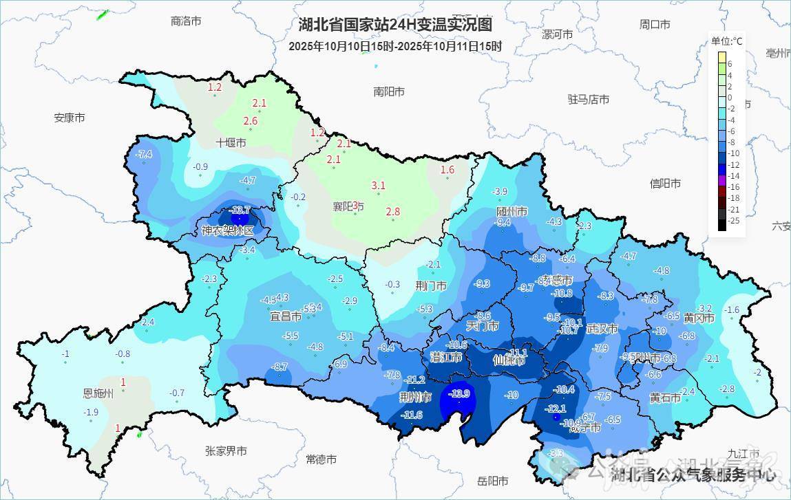 湖北日报讯(记者曾莉)10月11日,冷空气渗透南下引发湖北气温剧烈波动,省内气温呈现“西凉南热”的极端反差,襄阳和通城出现15℃温差。预计13日起,新一轮强降雨与冷空气将共同发力,全省气温将再降4至10℃,“秋老虎”彻底退场。