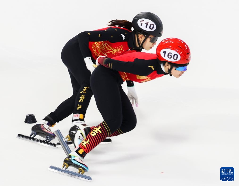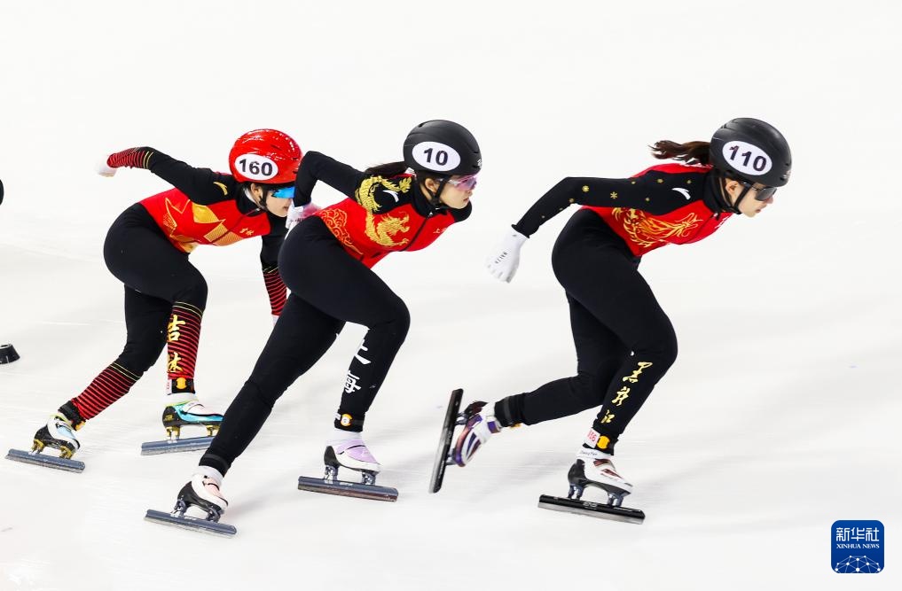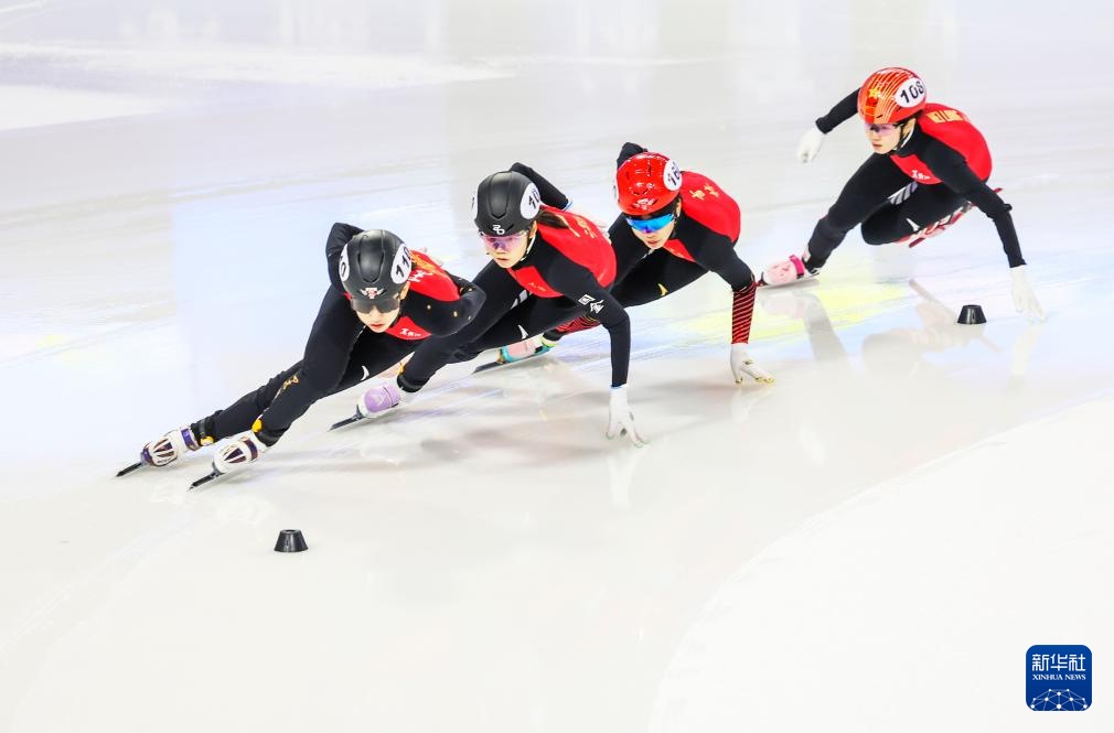 10月11日,黑龙江省冰上训练中心选手张延(右一)在甲组女子1000米决赛中。最终,她获得冠军。