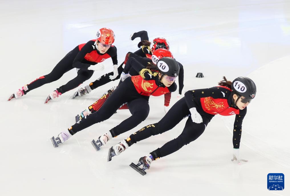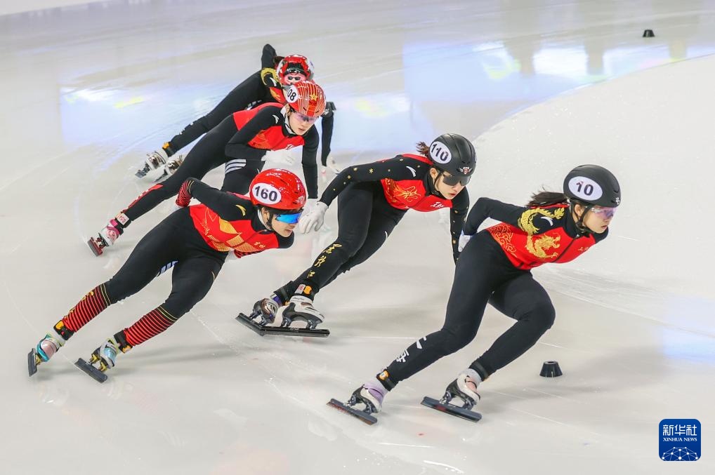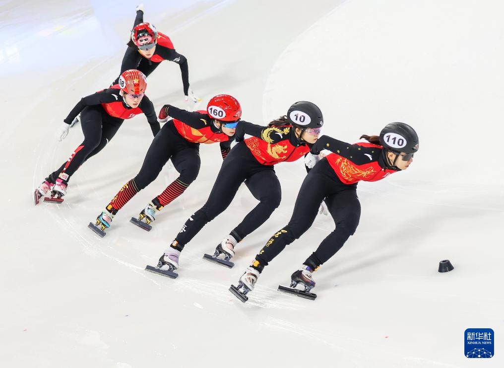 10月11日,黑龙江省冰上训练中心选手张延(左一)在甲组女子1000米决赛中。最终,她获得冠军。