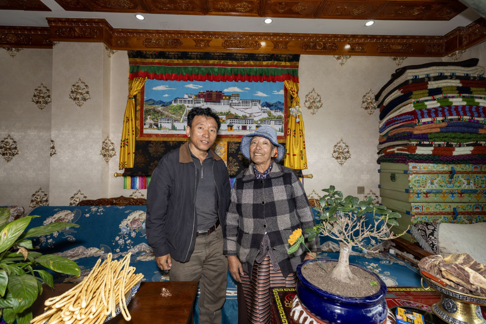 仁青曲珍(右)与儿子在自家客厅合影(9月16日摄)。新华社记者 姜帆 摄