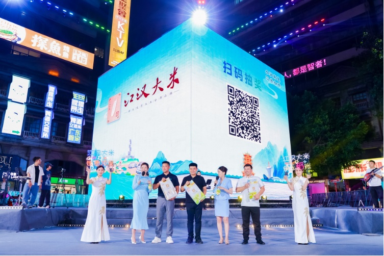 粤语乐队激情开唱,嗨翻全场;“江汉大米”五色灯牌汇成流动的星海,立体大屏生动呈现一粒“湖北靓米”从江汉平原金色稻浪到大湾区百姓餐桌的精彩旅程。