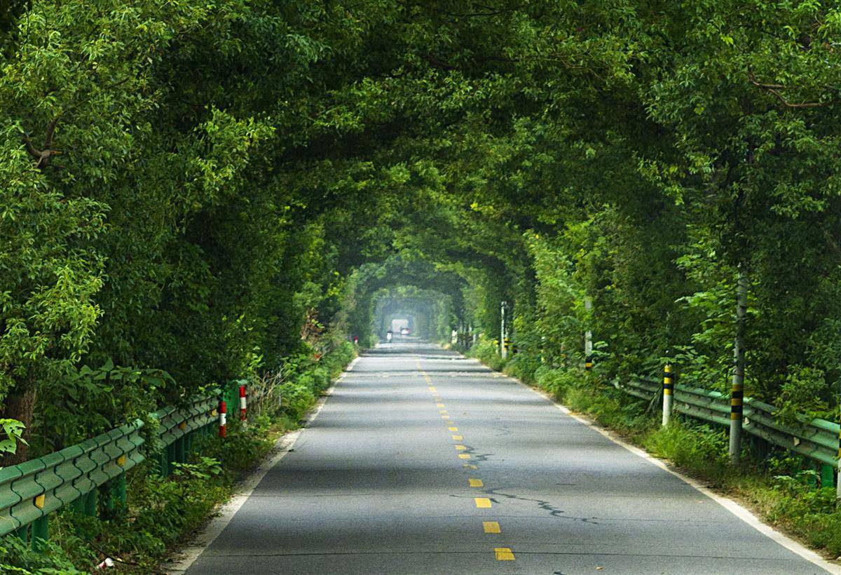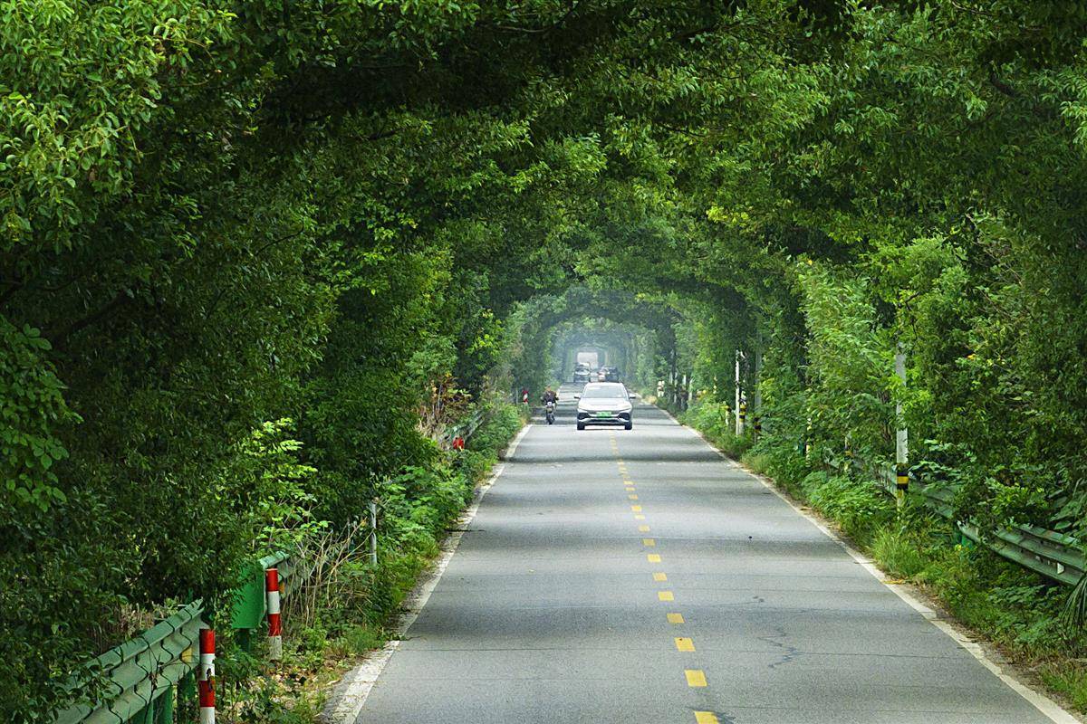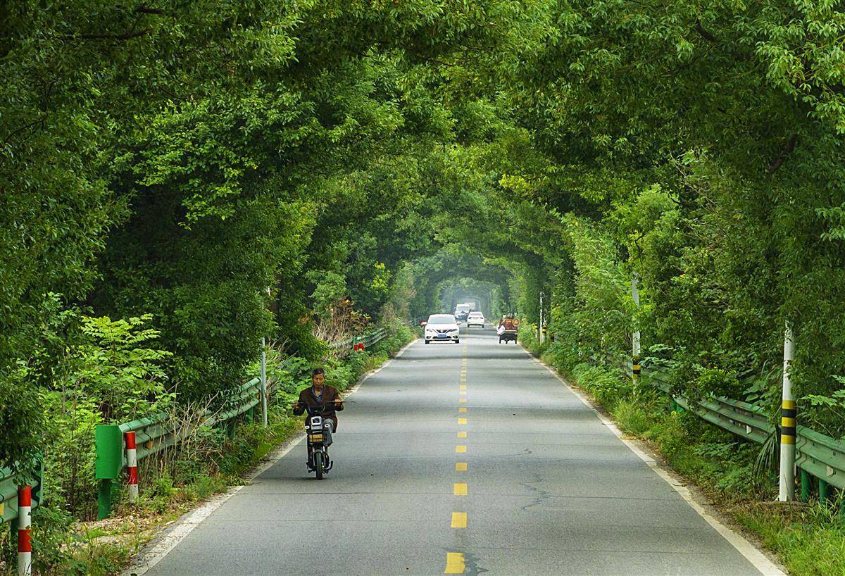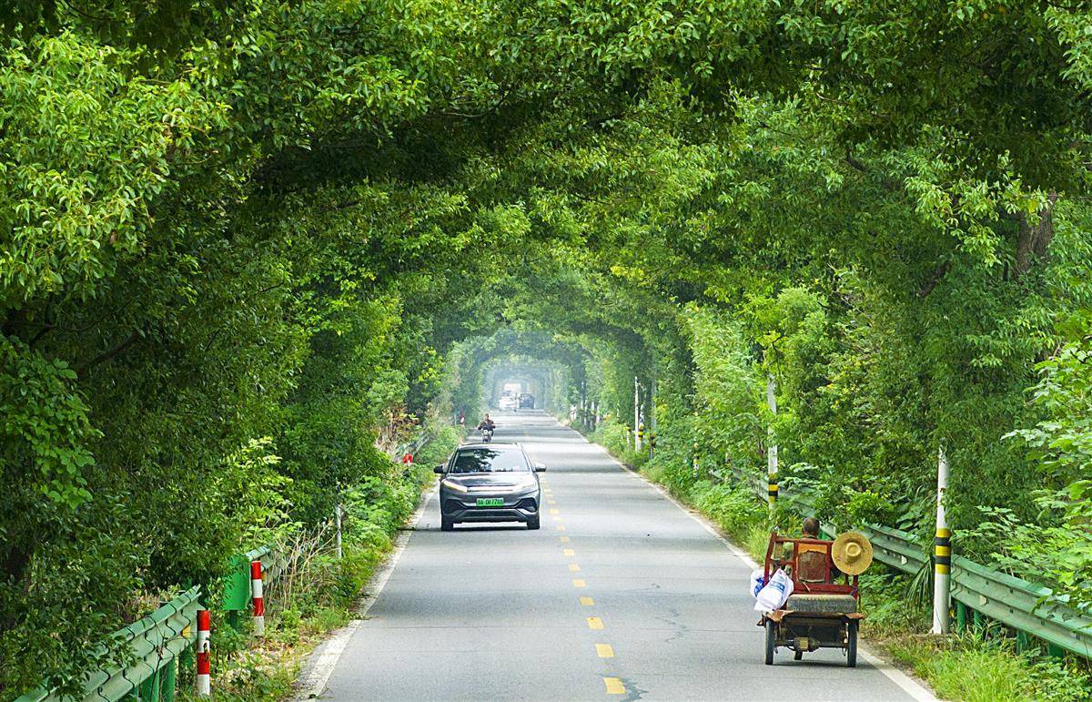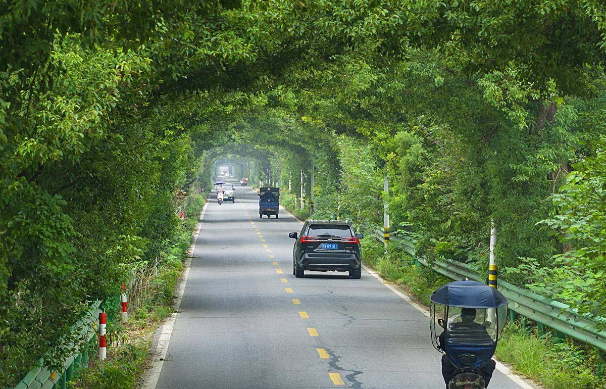 10月11日,武汉蔡甸区侏洪路约4公里长的乡间道上,路两侧的香樟树的枝叶相互交错,自然勾勒出一座葱郁的“森林隧道”,行人和车辆行驶在其间,仿若置身于绿色仙境,感受一路清凉。(湖北日报全媒记者 朱熙勇 摄)