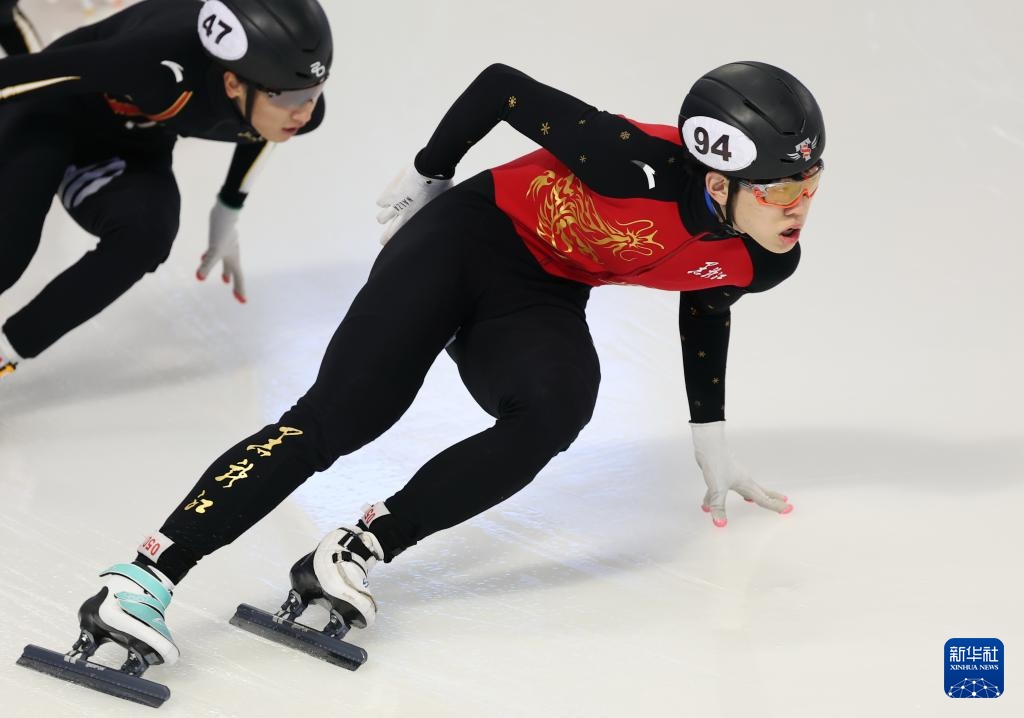 10月12日,黑龙江省冰上训练中心选手王天佑(右一)在甲组男子1000米决赛中。最终,他夺得冠军。